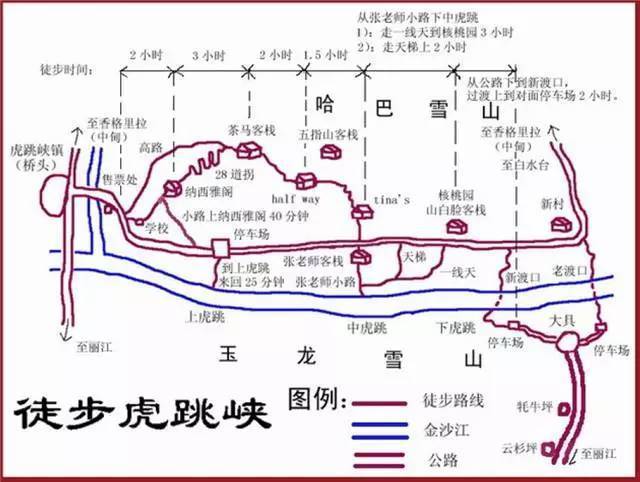虎跳峡徒步一般分两条:一条是从虎跳峡镇进入景区,沿着金沙江旁边的公路依次可以到达上、中、下虎跳;另一条是经典的高路徒步路线,从虎跳峡镇由一条上山的路进入景区,这条路在哈巴雪山一侧沿大峡谷前行可以一直到下虎跳,全长约30公里,快则一两天,慢则三天,线路沿途非常成熟,正穿反穿都可以,经常可以看到很多老外在路上徒步。