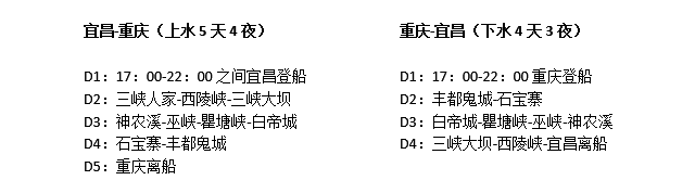目前三峡游轮行程主要介于宜昌至重庆段,分为上水行程和下水行程两种:上水行程为宜昌登船、重庆离船,共计5天4晚;下水行程为重庆登船、宜昌离船,共计4天3晚(不停靠自费景点三峡人家)。如果时间充裕,建议选择上水行程,如果时间相对紧张,建议选择下水行程。