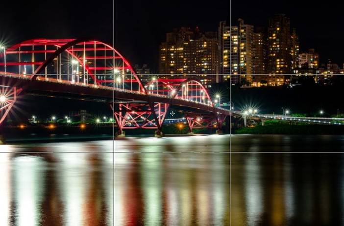 构图方面夜景通常使用对称构图或斜线构图。 对称式构图,具有平衡、稳定、相呼应的特点(这种构图比较简单就不展开说了)。