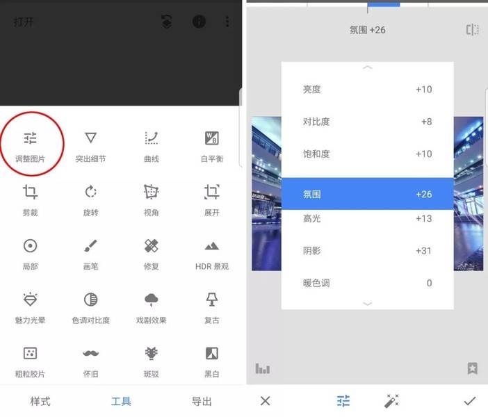 最后用Snapseed选一个喜欢的滤镜,旋转一下图片,调整一下氛围和感光度就可以了。
