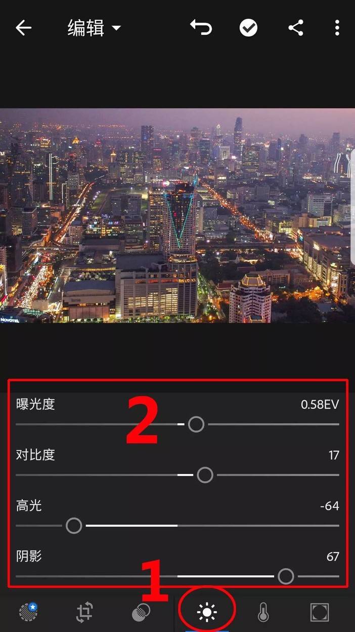 我们先把照片的亮度整体调亮,让细节更丰富,所以我们要适当增加曝光、对比度、阴影,同时也要减高光,数值参考如下: