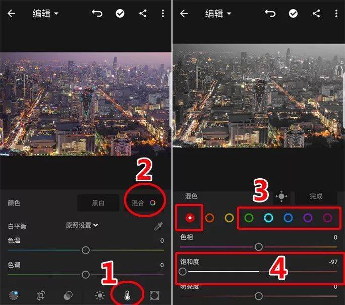 OK,我们点击下图标识“1”,进入色彩空间,点击“混合”,进入“混色”,依次调整红、绿、浅蓝、蓝、紫、洋红,将这6个色系的饱和度降至最低(-100)。