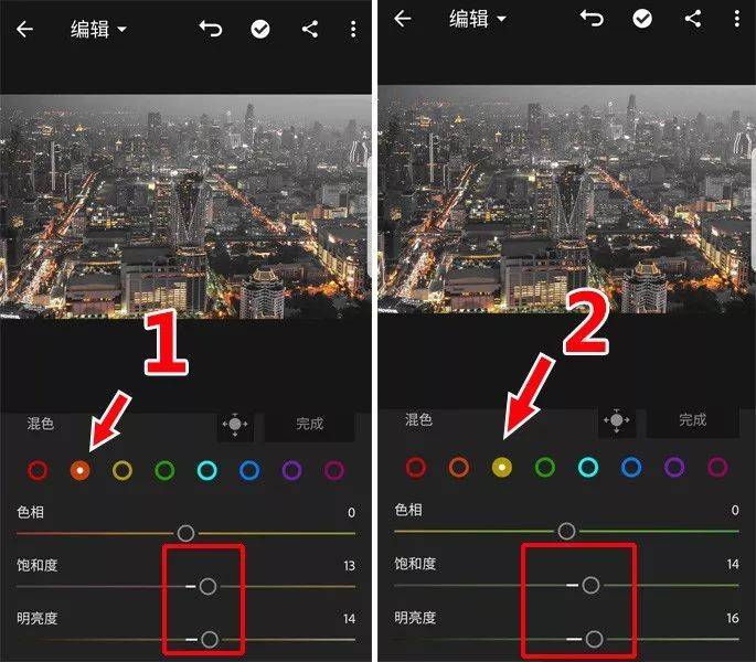 然后,我们再分别调整橙色和黄色,将两者的饱和度、明亮度适当调高,加强画面中的黄色和橙色,参数如下,点击完成。