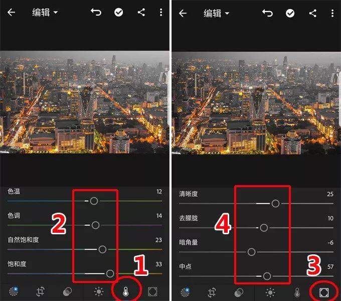 回到色彩空间,依次调节色温、色调、自然饱和度、饱和度,调出自己喜欢的颜色效果(数值如下,仅供参考);然后我们点击右图中的“3”,进入“效果”,调整清晰度等,增强照片的锐度。