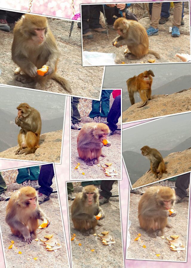 果不其然,一群老老少少的猴儿们上窜下跳争抢驴友们的零食,有个别猴子还装出一副可怜巴巴的样子,用乞求的眼神向驴友讨吃的。