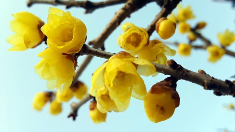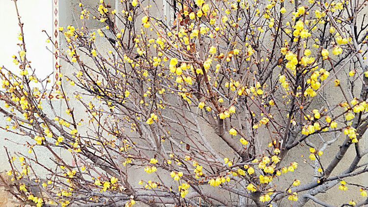 驻足在一家无狗的农户门口,呵呵,大有眼福。门口数枝梅,三月独自开。被誉为“花魁”的腊梅,在晨寒中坚强而高雅地盛开,暗香浮动,凌寒飘香。唯有“一树独先天下春,不与百花争时光”。