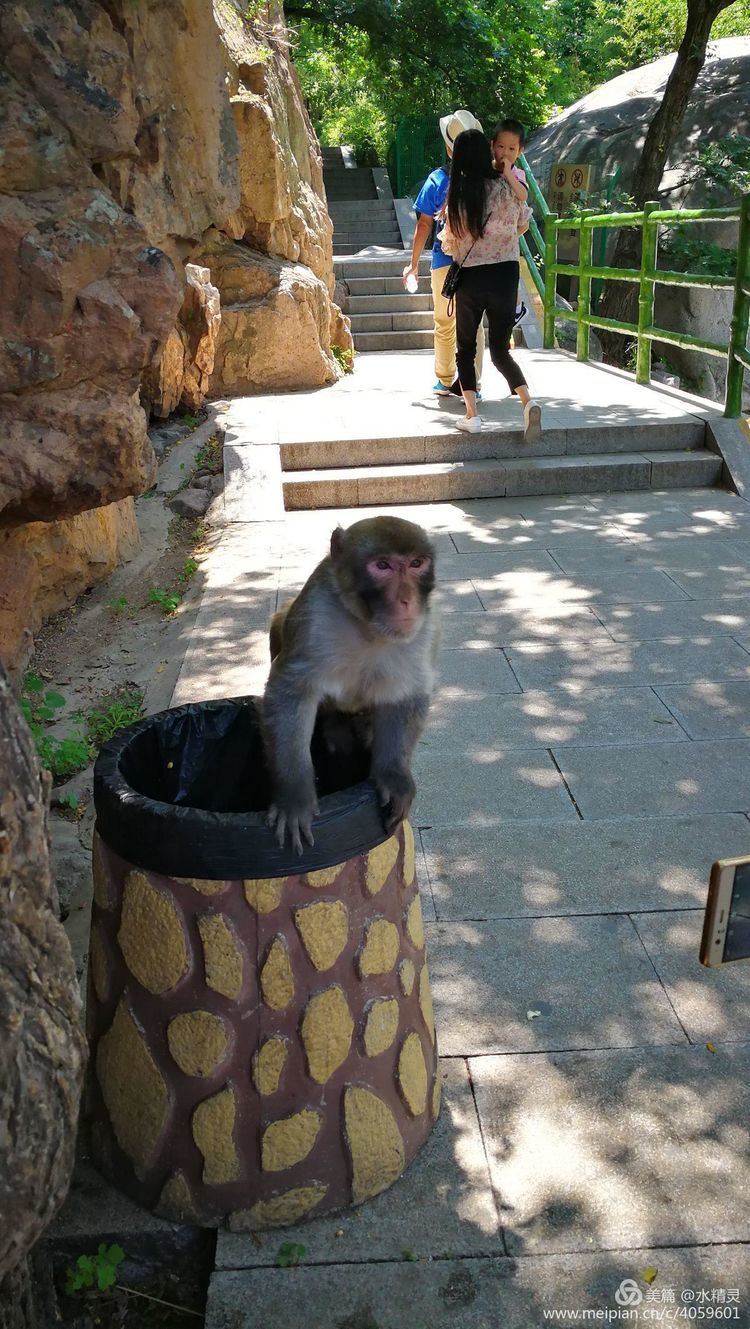 临景区门口处看到一只猴子,正眼巴巴看着游人,找食物吃。它在游人间悠闲的