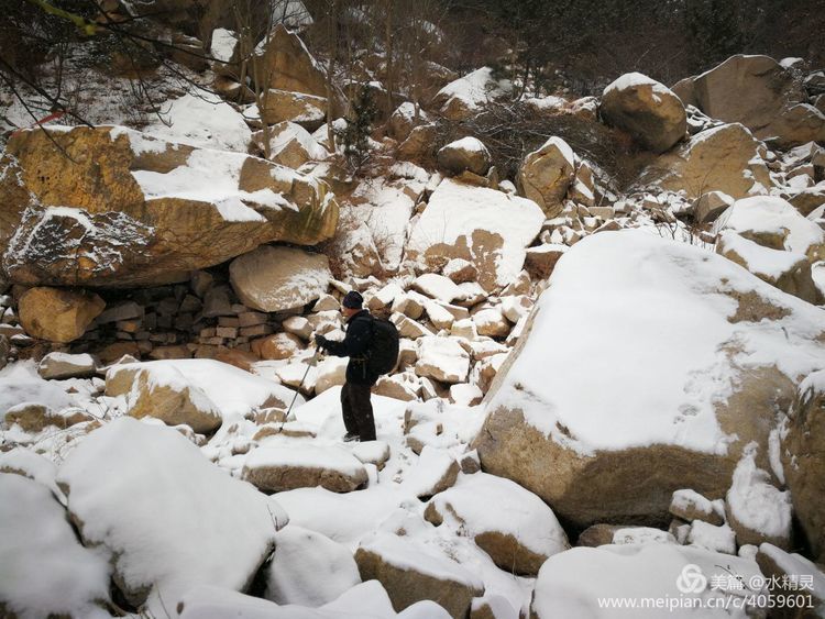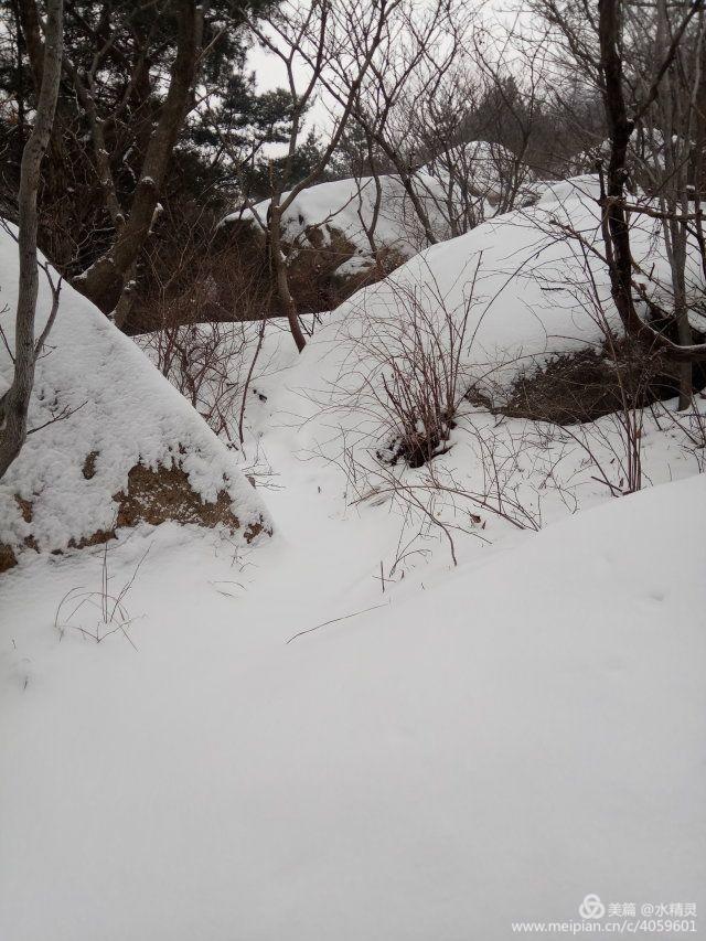 如果平时走这条路对驴友来说不算什么,可被大雪覆盖了的大山,所有的路都被遮掩了,即使再熟悉也是一场莫大的考验,有一个老驴带路是必不可少的,是不走错路的重要保障。红树林队里有都福大哥这样的老驴,真是我们的幸事。有几次都福大哥在后面帮助别人攀爬时,我就走在了最前面,面对眼前一尘不染没有半点印记的路,每走一步都兴奋的了不得,咯吱吱的留下一串脚印真是特别开心,可每一脚踩下去内心也是莫名的紧张,因为你看不到任何路的迹象,你不知道这样走下去是否是正确的路线,而且雪下掩藏了什么也是未知的,有时一脚下去还不知发生了什么人,已经扑倒在雪里了。感谢都福大哥一路上为我们领路开路,并帮助我们登上一个又一个难点。