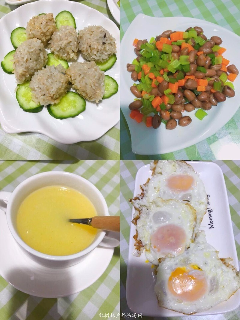 晓的早餐分享:糯米肉丸、西芹花生米、玉米粥、煎蛋、又是新的一天2018.3.20