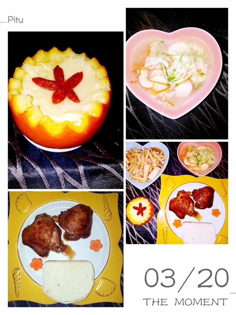 笑笑的早餐分享:香橙蒸蛋,照烧鸡腿块,番茄杂菌菇,日本豆腐鸡蛋汤