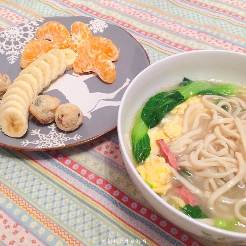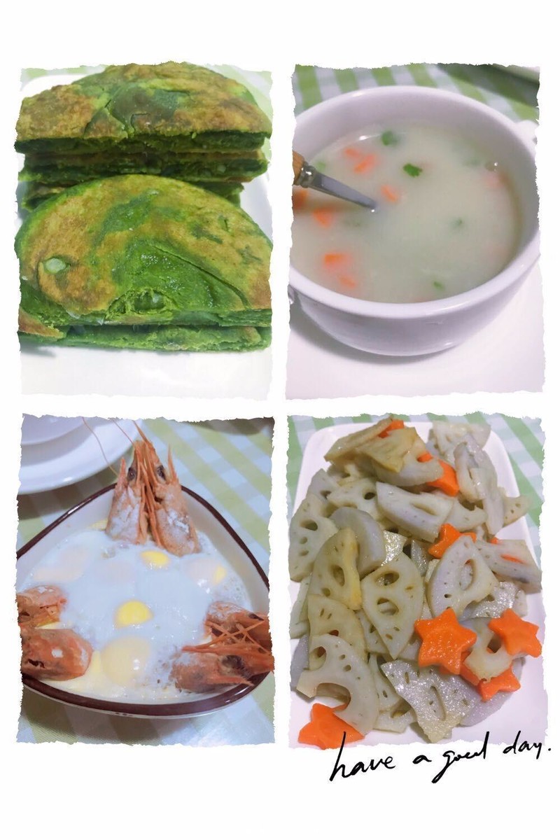 晓的早餐打卡:菠菜汁葱油饼、土豆疙瘩汤、虾扯蛋、拌藕片[太阳]2018.3.30