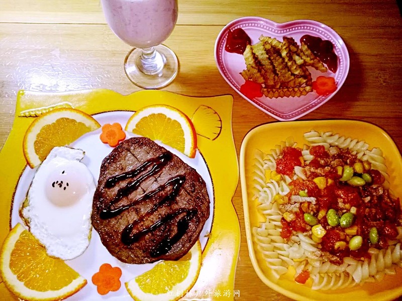 笑笑的早餐牛排,意大利面,薯条,草莓