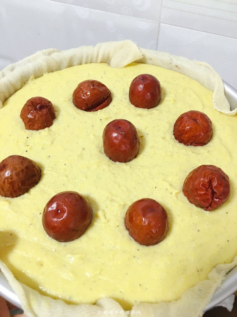 3、放大枣上蒸锅蒸50分钟即可。 黏米糕出炉,可直接沾红糖吃,也可以凉透,煎着吃。