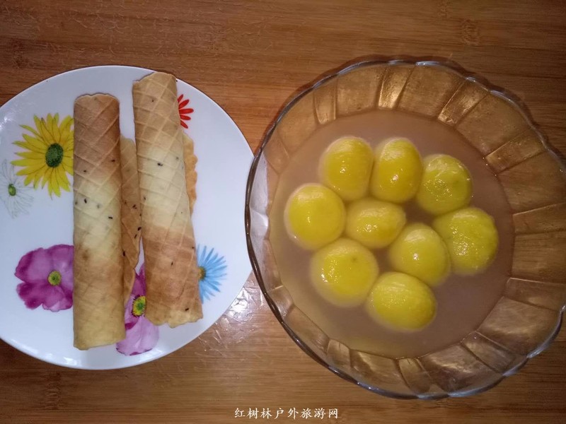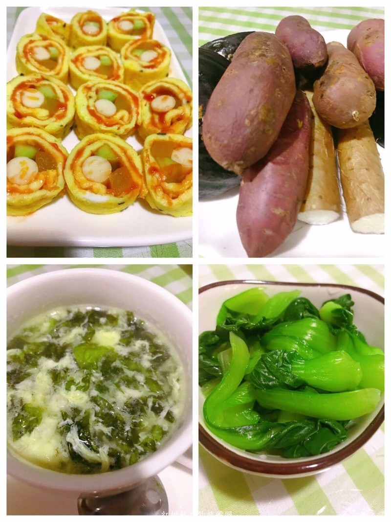 晓的早餐分享:蛋卷儿、烤地瓜、山药、南瓜、紫菜汤、一卤鲜油菜[太阳]
