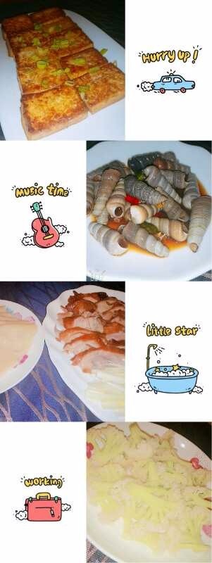 晚餐分享: 自制烤鸭,麻辣钉螺,香煎豆腐,凉拌有机菜花
