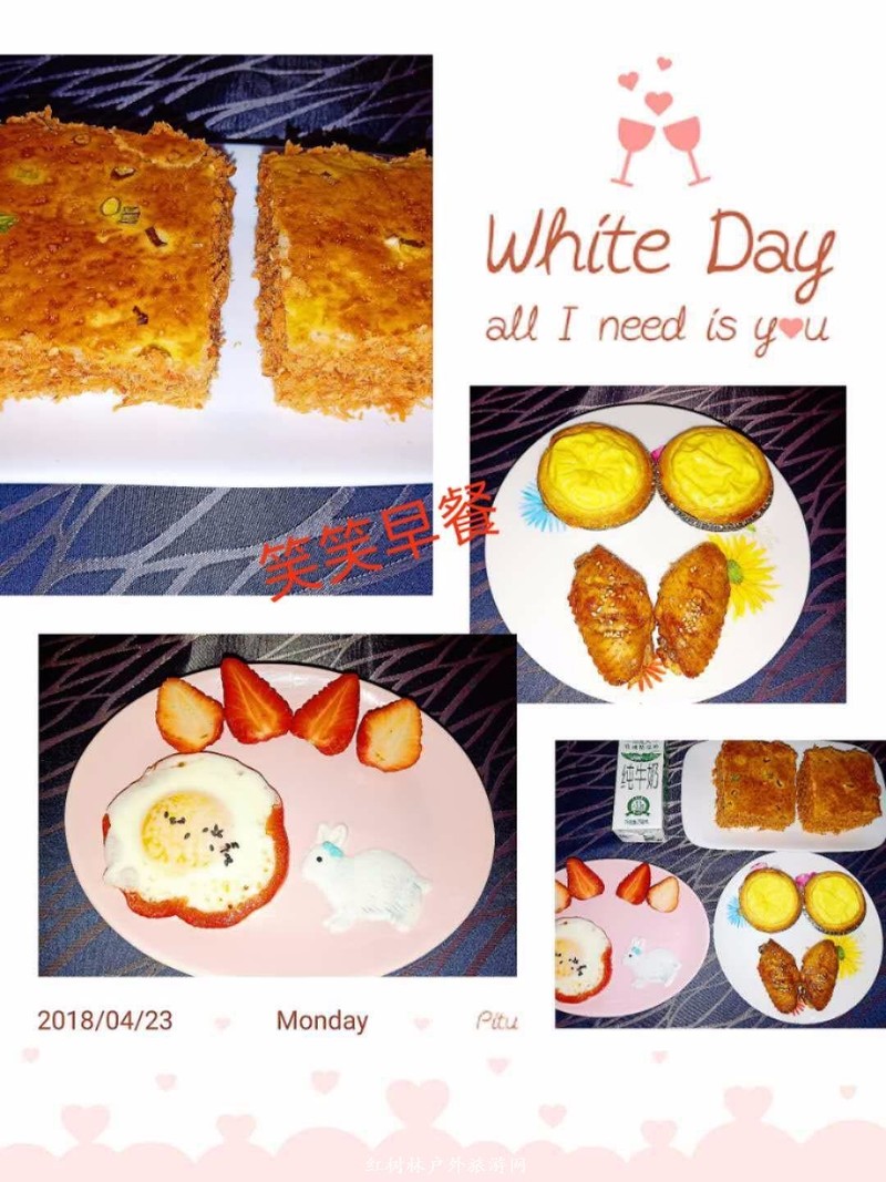 ,烤翅中,蛋挞,红彩椒煎蛋,牛奶。