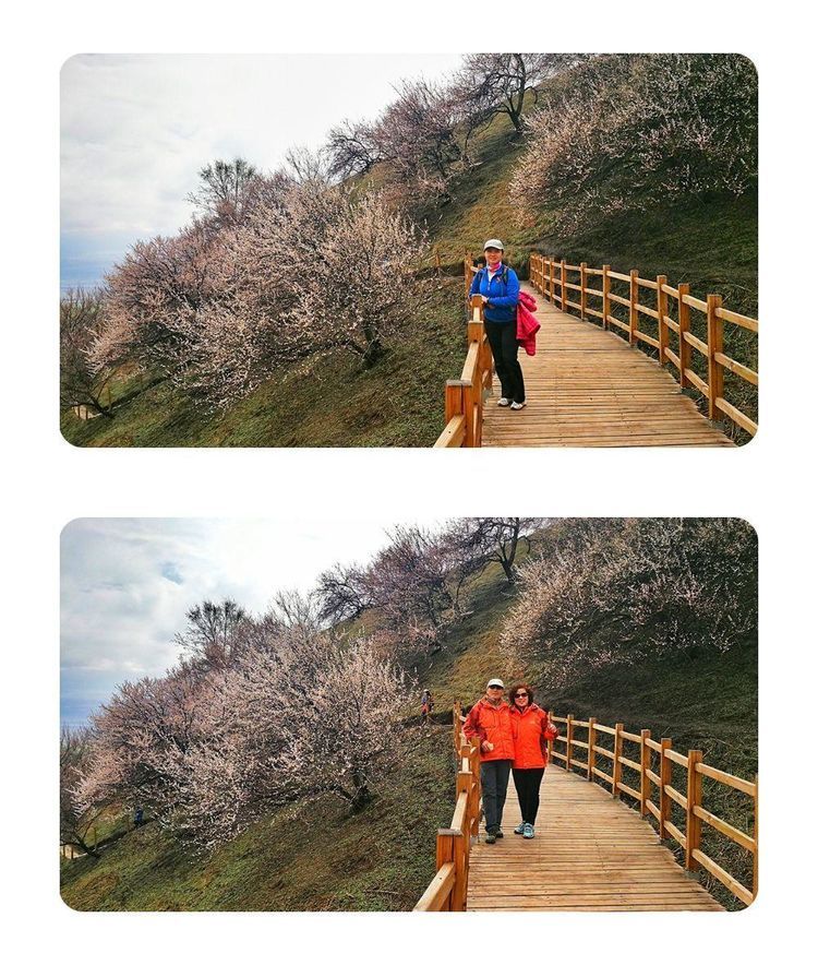 上天不忍让我们只看到阴云下的杏花沟,太阳悄悄的从云朵里露出笑脸,整个山谷立时随着阳光的流动呈现给我们另一副画卷,即使站在同一个地方已经看到了另一番景象,有了光影的杏花沟更加美丽迷人。