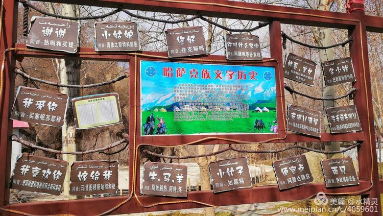 进入景区首先看到的是哈萨克族文字史,还有简单的哈萨克语与汉语发音对照,你学会了哪一句呢?哈哈,我们的马哥还真学会了一句哦,每次冲着鸿雁姐说“买塞呢苏耶穆”时,鸿雁姐都开心的合不拢嘴。