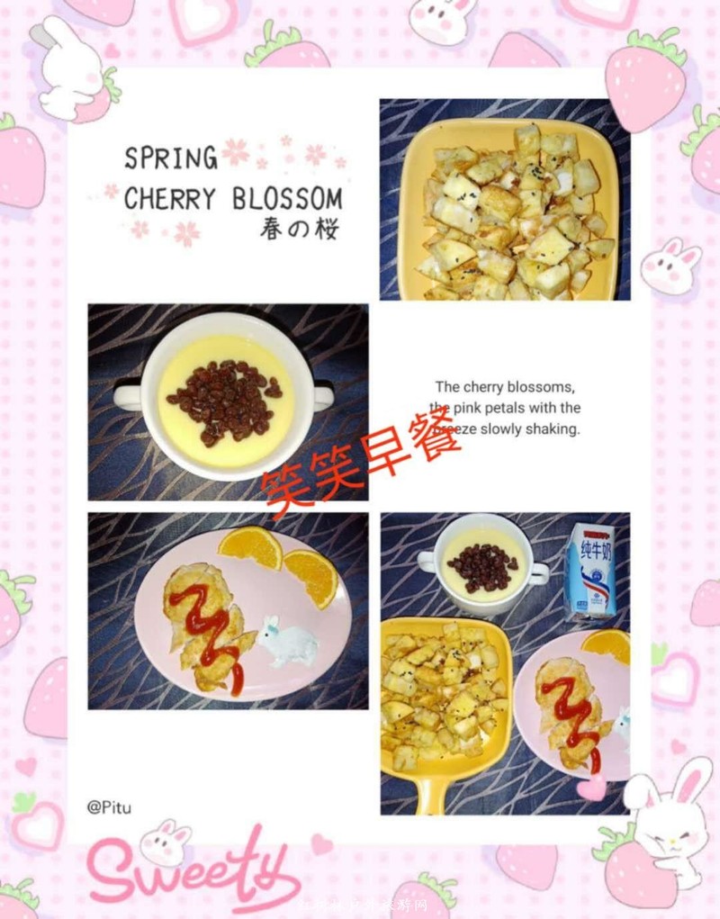 笑笑早餐分享: 小猪 佩奇,土豆泥沙拉(蟹肉 棒,青豆粒,胡萝卜粒,红肠粒,虾仁),橙子 煎蛋,芒果圣女果奶昔2018.5.4