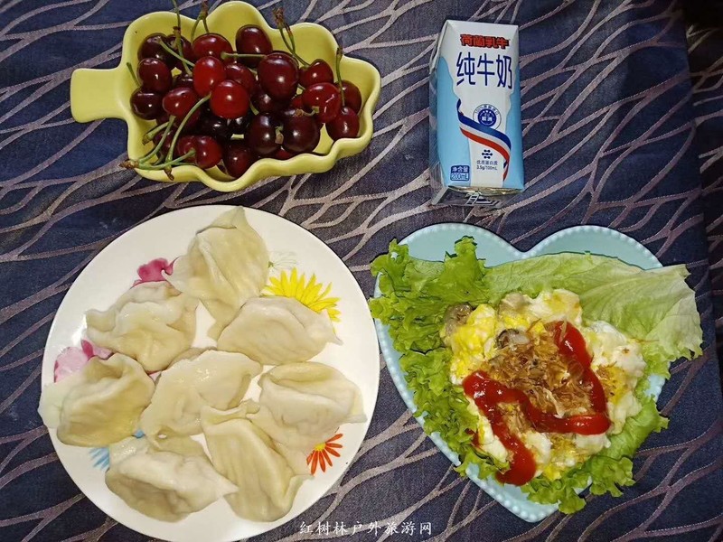 笑笑早餐分享:白菜猪肉水饺,蚵煎仔(海蛎肉,鸡蛋,柴鱼片),樱珠,牛奶。(2018.5.10)