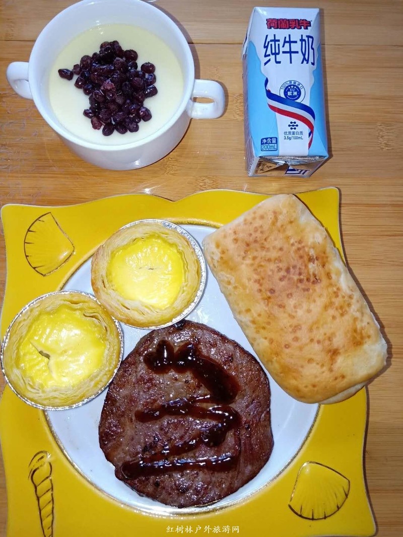 笑笑的早餐分享: 牛排,,油酥火烧,蛋挞(昨天烤的)红蜜豆鸡蛋羹,牛奶(2018.5.14)