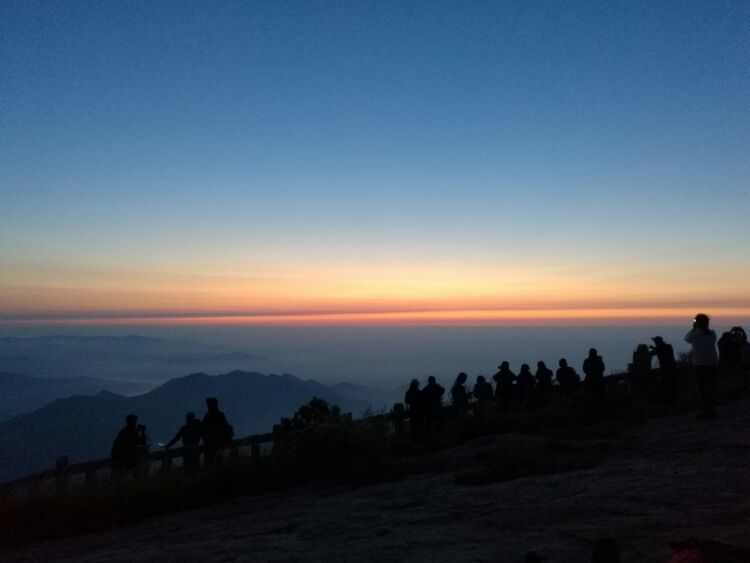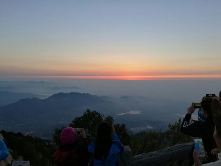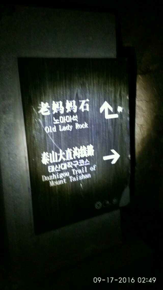 大约十分钟后再次整装出发,这时大约凌晨两点了,睡意开始侵袭缺氧的脑袋,腿脚也因为太疲劳不听使唤了。泰山相比崂山海拔高出400多米,去程路途比较短,相对坡度也更加陡峭,途中常有巨石挡路,须攀岩附葛才能前行。望着坡度较高的地方真是心有余而力不足啊,上紧心里的发条,手脚并用跪着往上蹭,这时我才体会到同事车车跟我一起爬山的体会,想喊不敢喊,想哭不敢哭,真是一步都走不动啊。只要不死就得继续爬。记得女儿高考前夕最后一次家长会,所有家长都要给孩子写一封信,写上几句鼓励的话,我给女儿写道:“孩子,自己选择的路跪着也要走完!”今天这句话应验在我身上了。