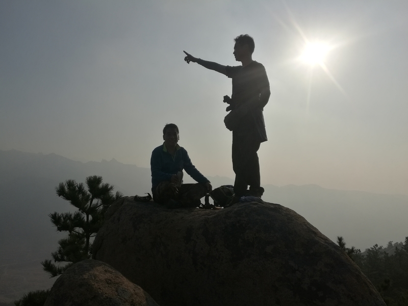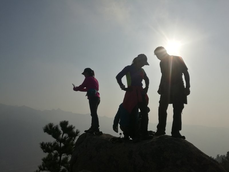 这支27人的队伍在登赢集合,8点多点进入铺满落叶的山路。叶子被脚底下的风一带,忽闪着黄色焦干的叶面,很和谐地低声沙沙响着。在山的东边,雾气已被太阳挤走,太阳已渐渐地露出笑脸,从雪白的云彩边上透过零星的树叶温柔地洒落在我们脸上,好似一朵朵花纹。