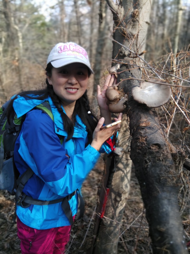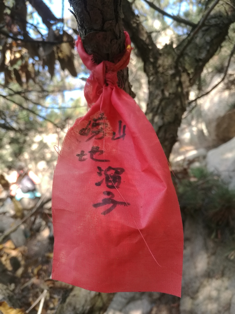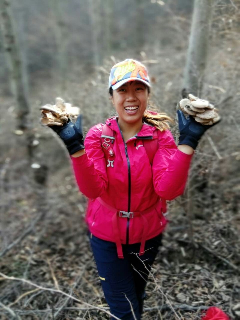 翻过两座山头,在向北的陡坡上,因为悬崖遮住了太阳,铺满松树枝的山路有点湿漉漉的。偶见参天大树上长着小翅膀般的蘑菇,我们喜出望外,迅速围拢,举起相机、手机好一个猛拍,手疾眼快地先下手为强,蘑菇入袋,已收入囊中。哈哈,队长说了,中午可以丸子炖蘑菇了,有口福。