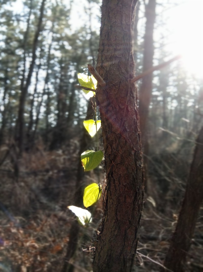 山野中的大树上有这个季节罕见的一小丛不成气候的绿叶,经阳光的照射,点缀出一抹浓浓的绿色,渲染着一缕珍贵的生机。我如醉如痴地呼吸着冬季里难得的甜蜜醉人的清新空气,舒展着有点绷紧的身躯,像山里的百灵亦想放声歌唱。