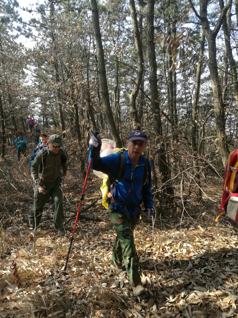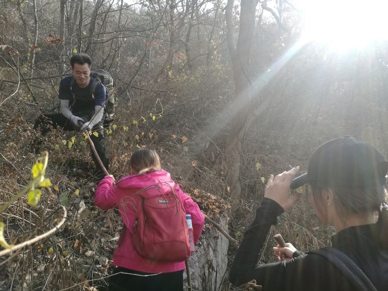 今天天气格外的暖,浑身冒起汗丝丝的热气。野路沙土暴露,野草和黄树叶覆盖,荆棘丛生。有的地方黄土和烂草散发出本来的气味。勇猛的福山湾为我们一路徒手披荆斩棘,始终走在前头,为我们“遮风挡雨”,在危险之处用登山棍一一拉上我们弱女子。