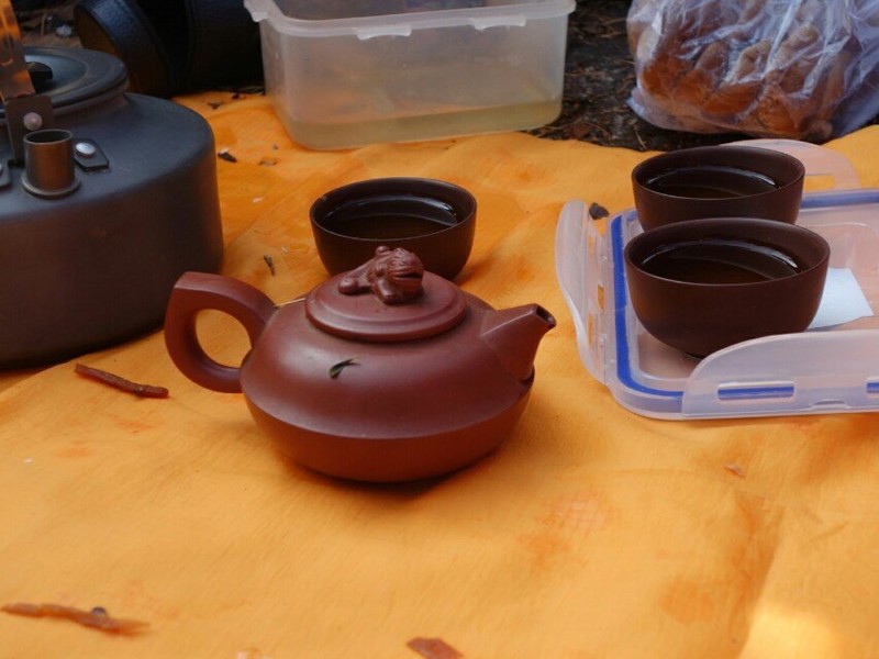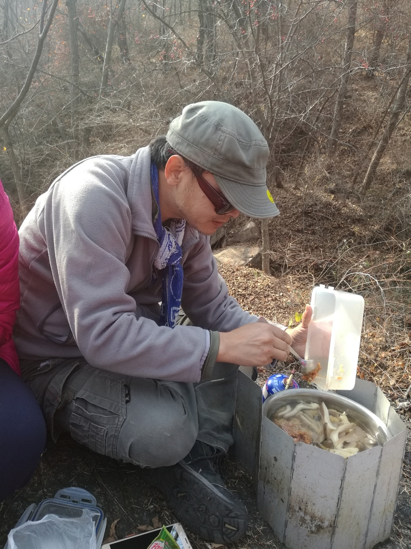 中午,我们在雨场子的一块山石平地中休息,可爱的红树和山辻队长,还有热心的双龙双福为我们现场制作美味的丸子蘑菇汤等,驴友自己亲手采摘的蘑菇吃起来格外的鲜美!我三碗下肚,已撑得几乎直不起腰来,更别说登山减肥了。