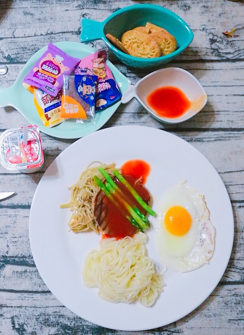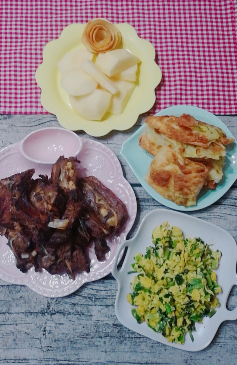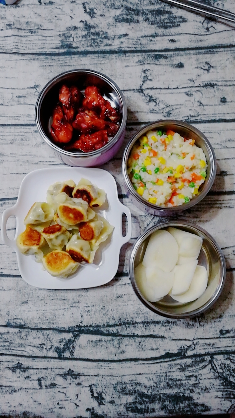 六点二十起床,先和面醒着,提前腌制好的鸡翅上烤箱,这时切菜,切肉,拌馅。鸡翅翻锅。擀皮包饺子,包到十来个,电饼铛热锅上油,再包十来个,上电饼铛。炒锅开火上油同时鸡翅装盘,所有炒米饭辅料进锅,电饼铛内放一大勺水浆,盖锅。炒锅内放入米饭,煸炒。。。。出锅装盘,码好后,喝口热水稍微一等锅贴出锅~~抬头一看,七点五分