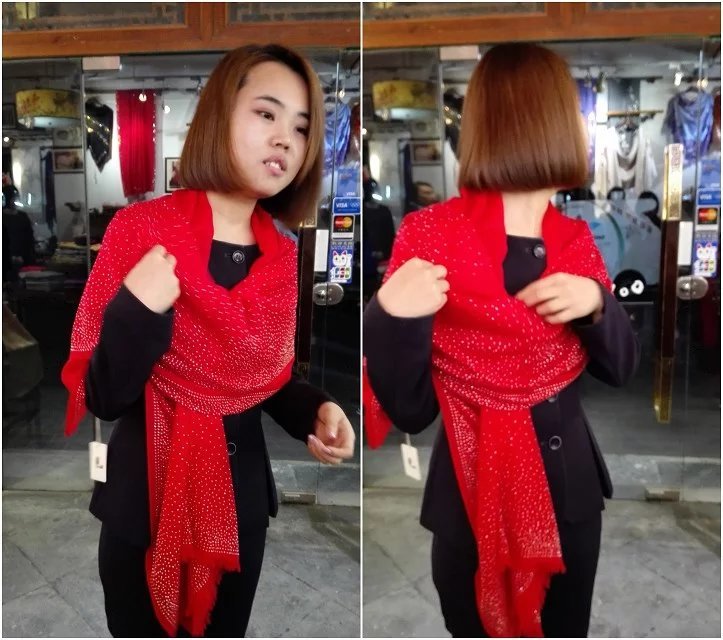 进了一家围巾店,我说看好姑娘后边那条红围巾了,姑娘绝对热情的告诉我,那条围巾售价19800RMB,我晕。她直接给我介绍了现在围的这条,2680RMB,而且迅速的围给我看了效果确实很
